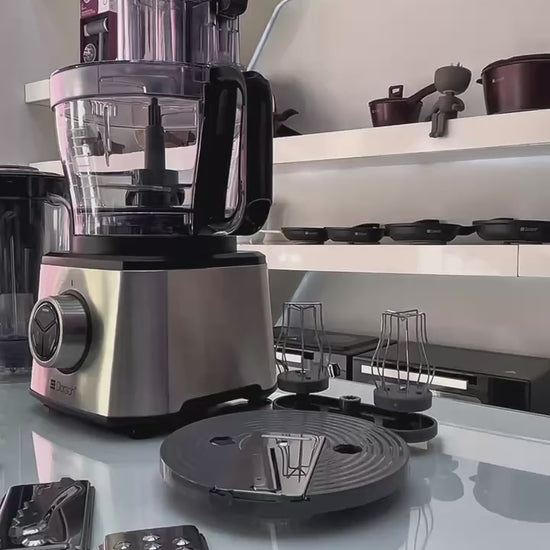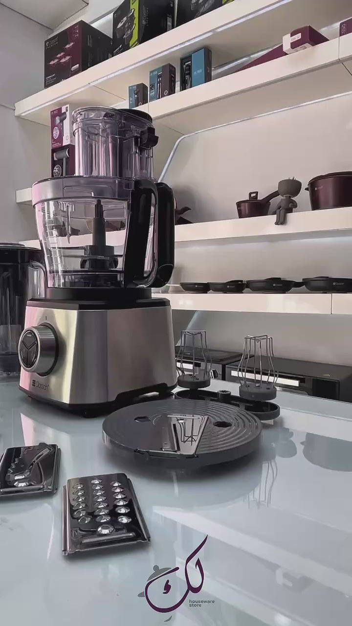 • تتضمن مجموعة من الشفرات والملحقات القابلة للتبديل، مثل شفرات التقطيع، وأقراص التقطيع، وأقراص التقطيع، وإبريق إضافي سعة 1.5 لتر، وعصارة الحمضيات.